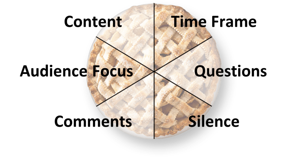 - Take questions along the way: Say, “I know I have thirty minutes total. I have divided my talk into three topics. After each topic, I will take questions.” People are then not forced to wait until the end to ask a question they had during the first 5 minutes. Or just say, “I will take questions you have at any point when I am speaking.”